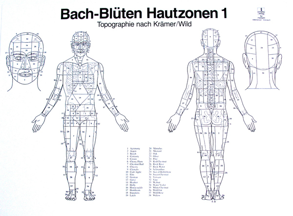 Poster des zones cutanés. Texte en allemand, nom des zones/fleurs en chiffres et anglais
