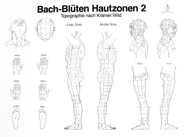Poster des zones cutanés. Texte en allemand, nom des zones/fleurs en chiffres et anglais